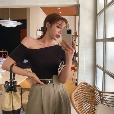 天鵝頸性感斜肩短袖